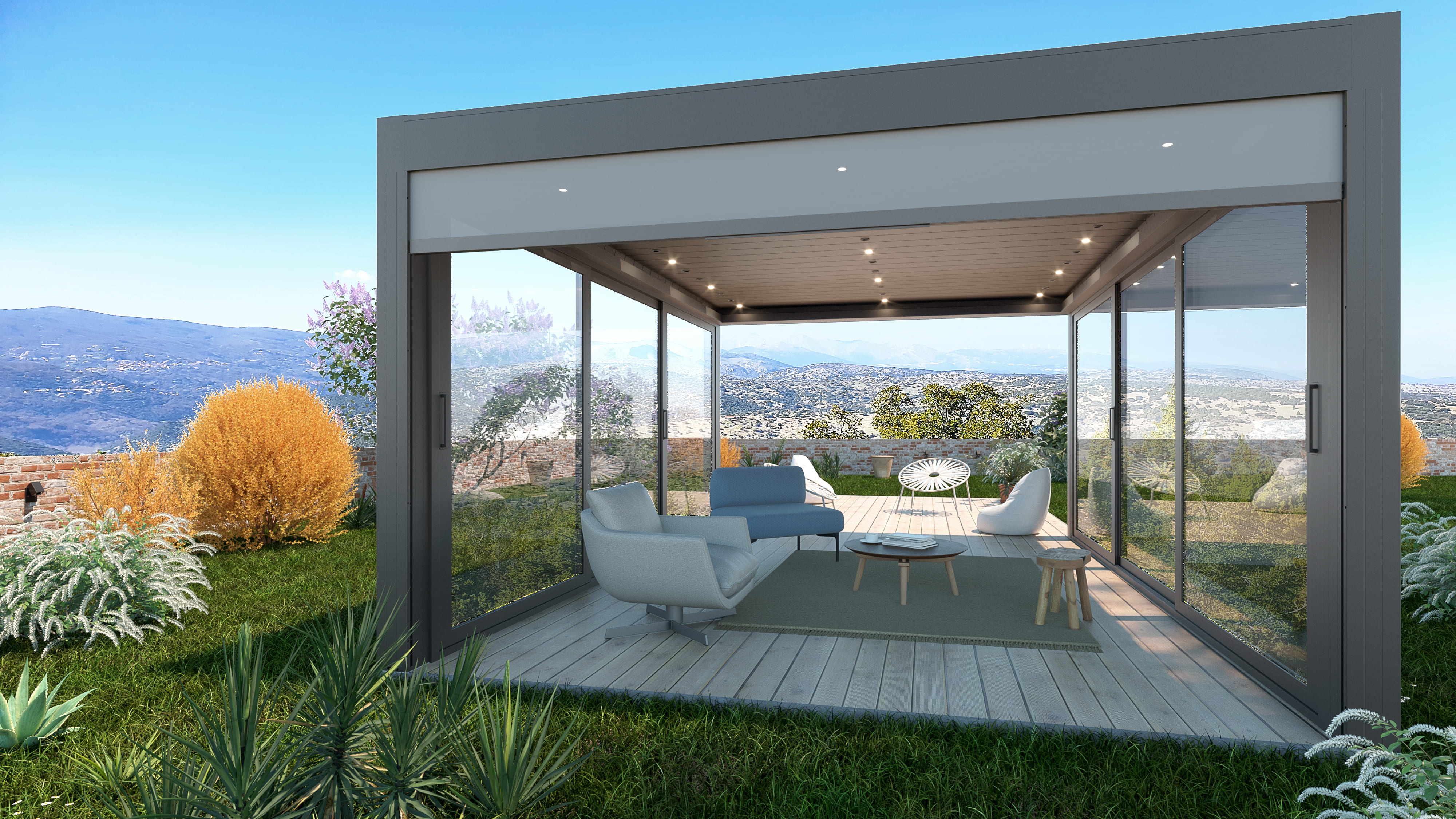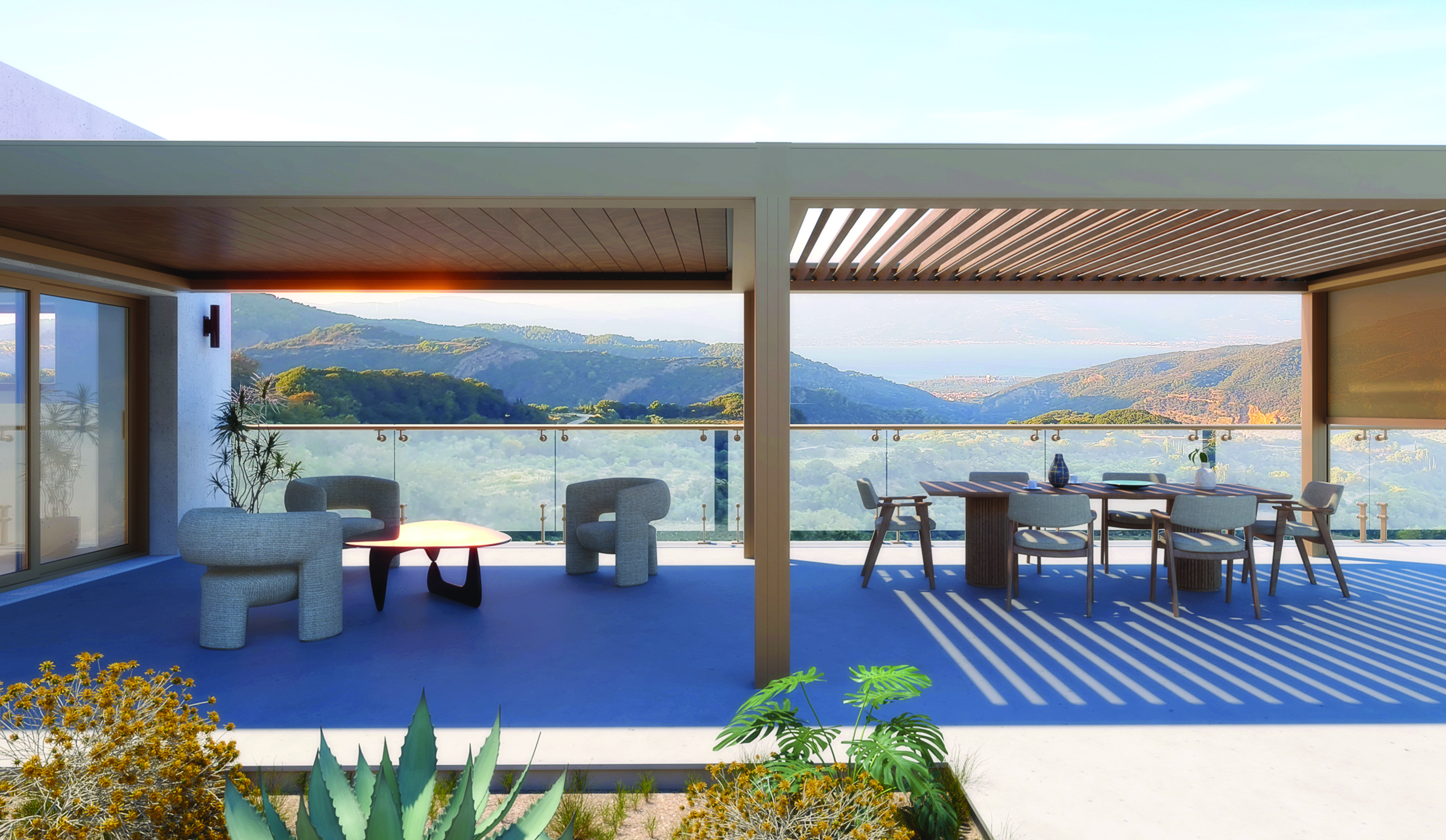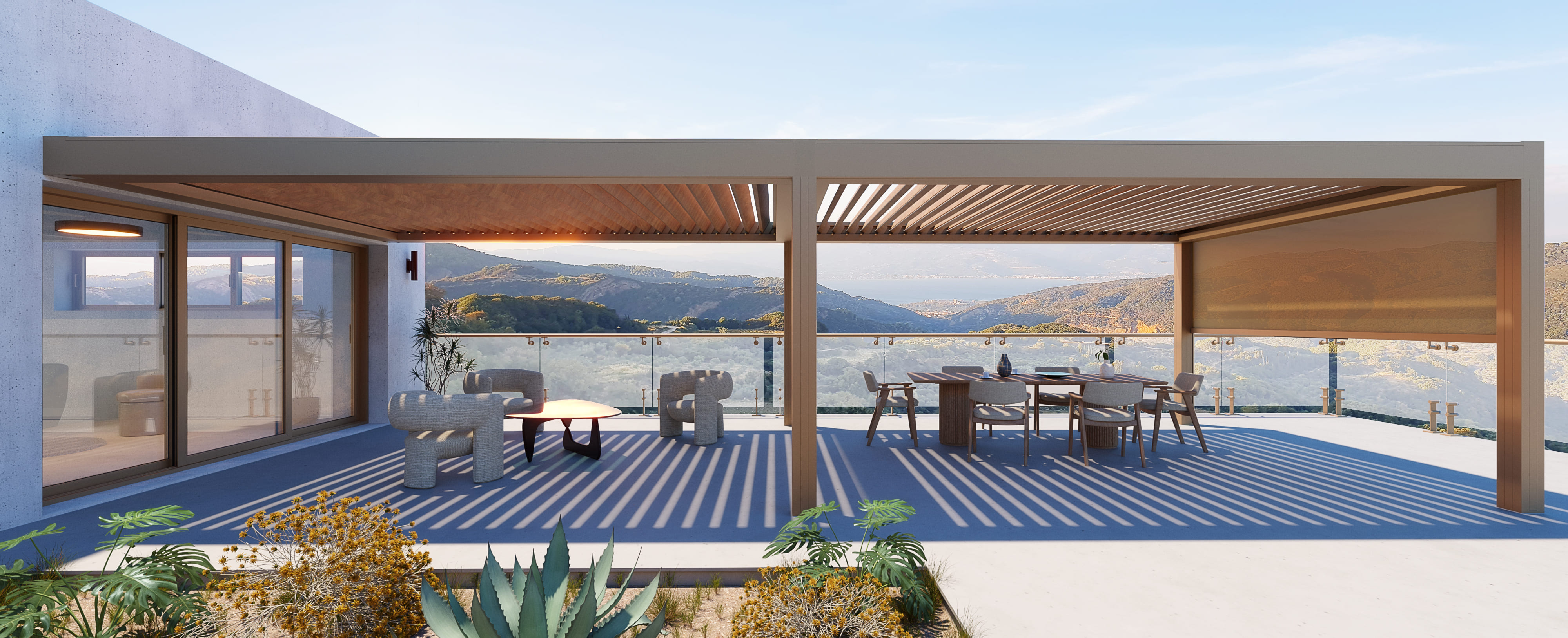 La bioclimatica senza compromessi, top di gamma della serie Louvresystem®. Tende integrate nel fascione perimetrale e zip completamente integrata nel palo, gronde perimetrali che possono coprire grandi dimensioni e si adattano a progetti residenziali e commerciali. LA soluzione perfetta per chi vuole raggiungere il massimo del comfort per una struttura outdoor: possibilità di integrare le vetrate perimetrali e le tende ombreggianti in una struttura lineare e d’ impatto.Scopri il piacere di vivere il tuo outdoor grazie alle linee essenziali e le prestazioni incredibili della bioclimatica Alghero.